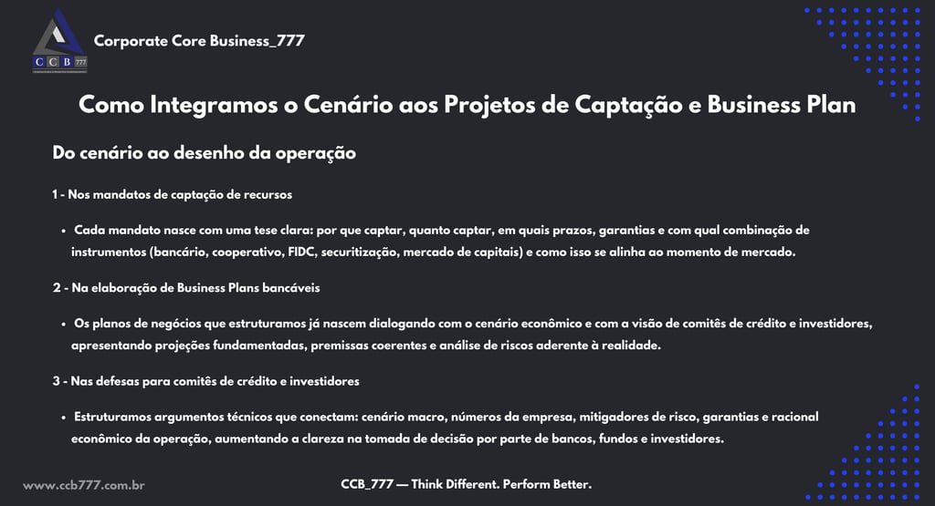 Toda a nossa leitura de números e cenário é construída exclusivamente com base em fontes confiáveis: bancos centrais, órgãos governamentais, institutos de estatística, reguladores, organismos multilaterais, associações setoriais e veículos de comunicação especializados de alta reputação. Não inventamos números, não utilizamos estimativas sem base empírica e não “maquiamos” a leitura de risco. Nosso papel é oferecer clareza técnica, para que empresas, bancos e investidores possam tomar decisões informadas, sustentáveis e alinhadas à realidade do mercado.